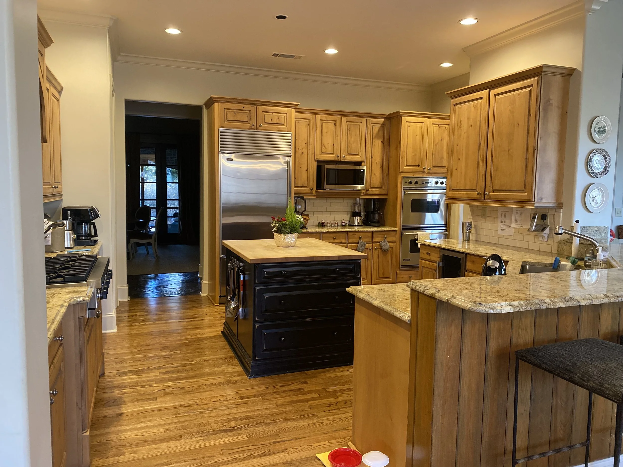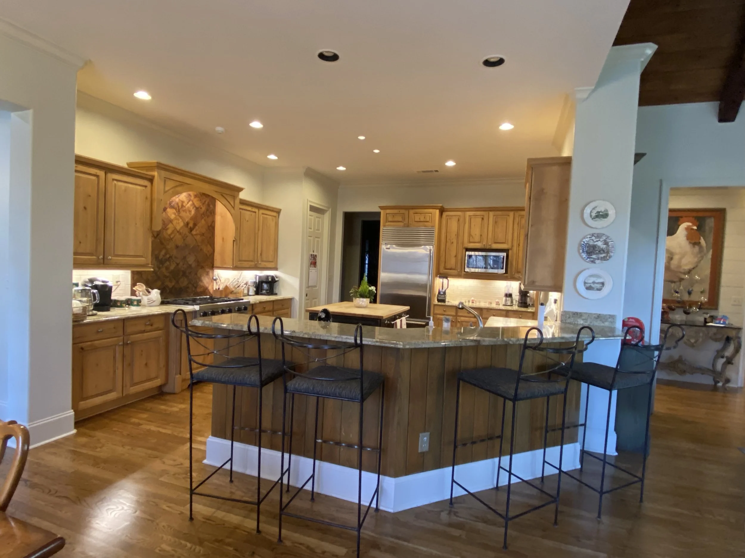 Alongside the kitchen updates, we refreshed the hearth room with newly painted walls and cabinetry, new furniture, and new rug—creating a seamless flow between the two spaces.