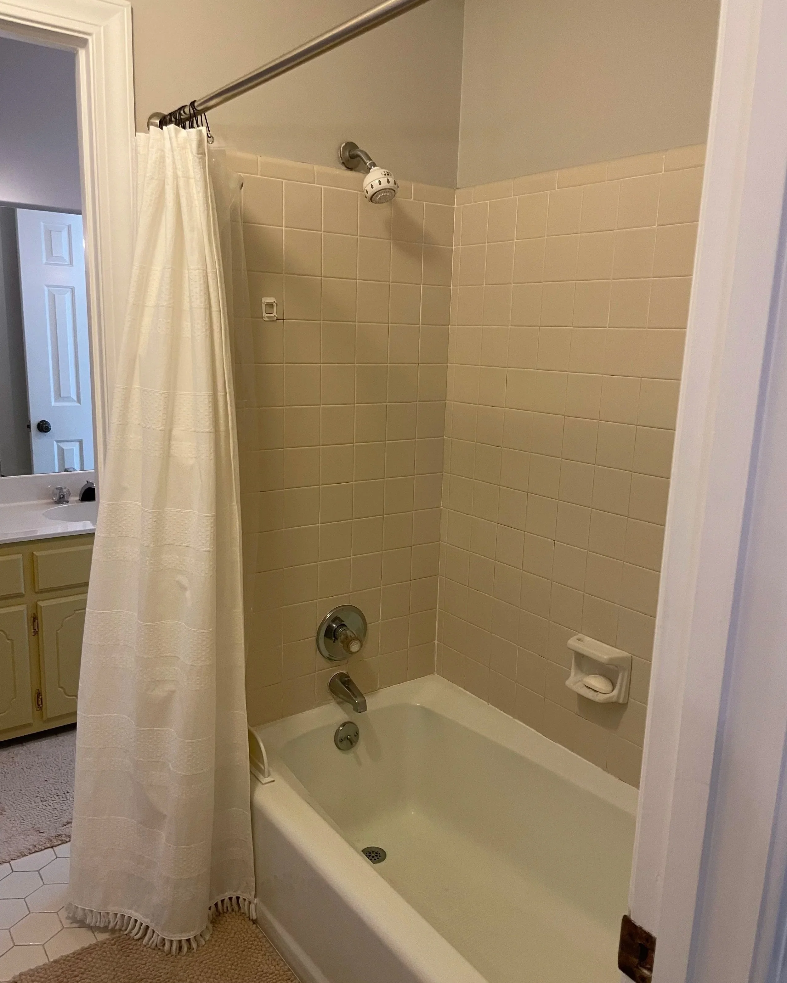 The refreshed palette of crisp white walls and tile, a bold shower accent wall, patterned floor tile, and warm stained wood cabinetry creates an inviting and cohesive look. We also intentionally incorporated mixed metals—pairing brass mirrors and sconces with brushed nickel faucets and cabinet hardware. The result is a balanced, welcoming space that feels both thoughtfully designed and timeless.