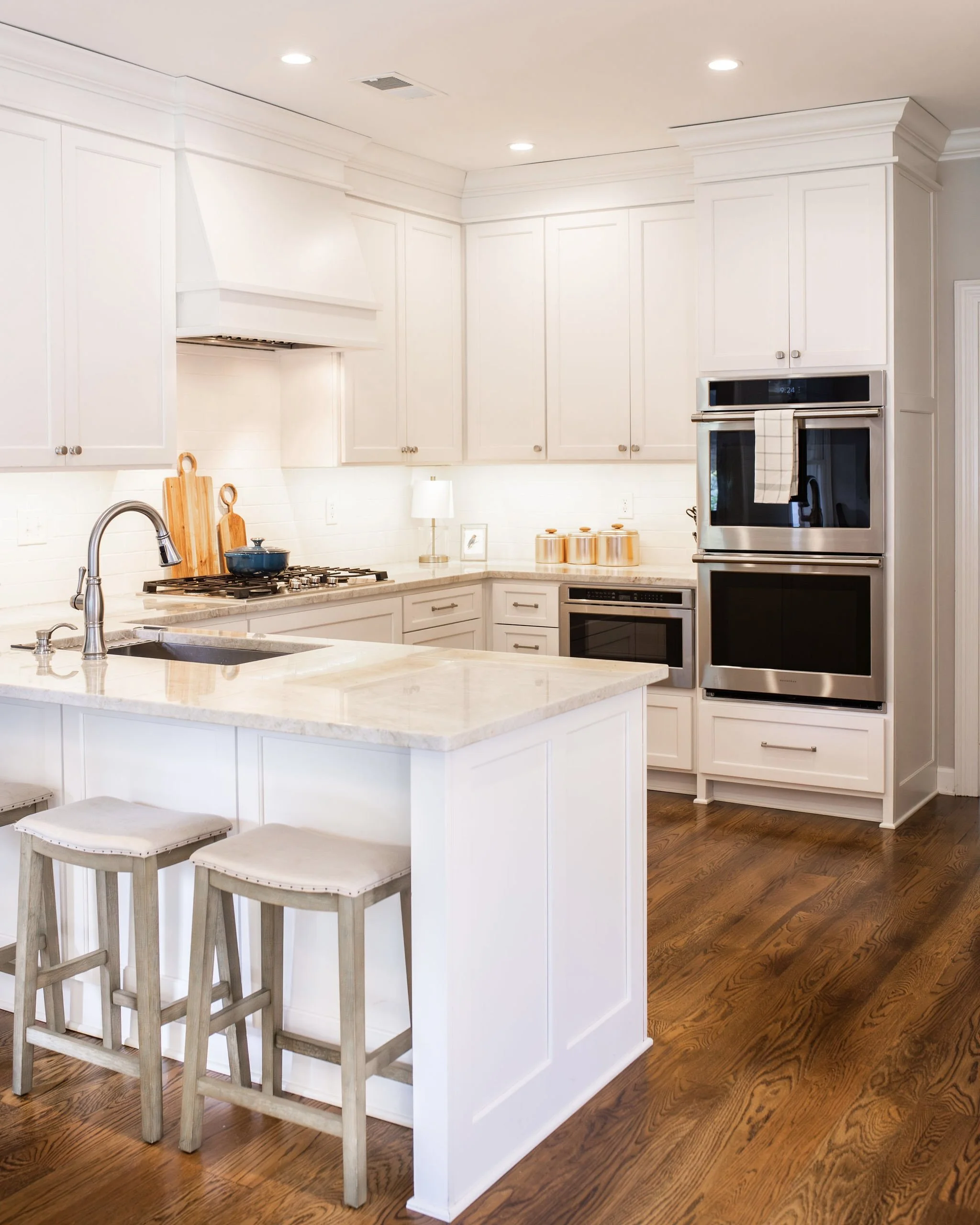 The new layout also allowed us to incorporate an overhang with barstool seating—perfect for casual meals and gatherings. Custom wall cabinets now extend to the ceiling, maximizing storage and adding a tailored, finished look. All cabinetry, fixtures, and appliances were updated with a clean, timeless aesthetic in mind.